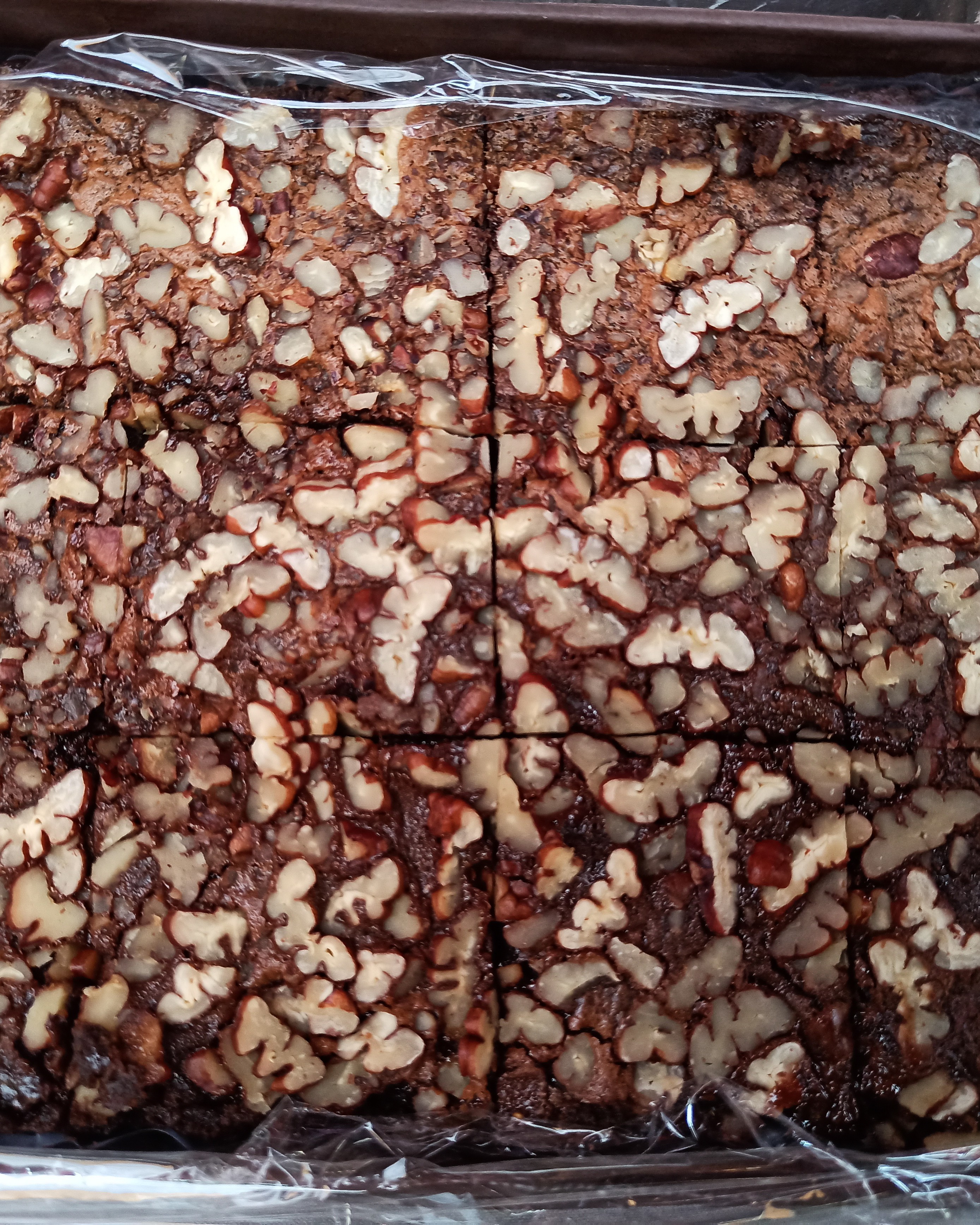 46% wholewheat brownies with jaggery with roasted pecans. Contains eggs.