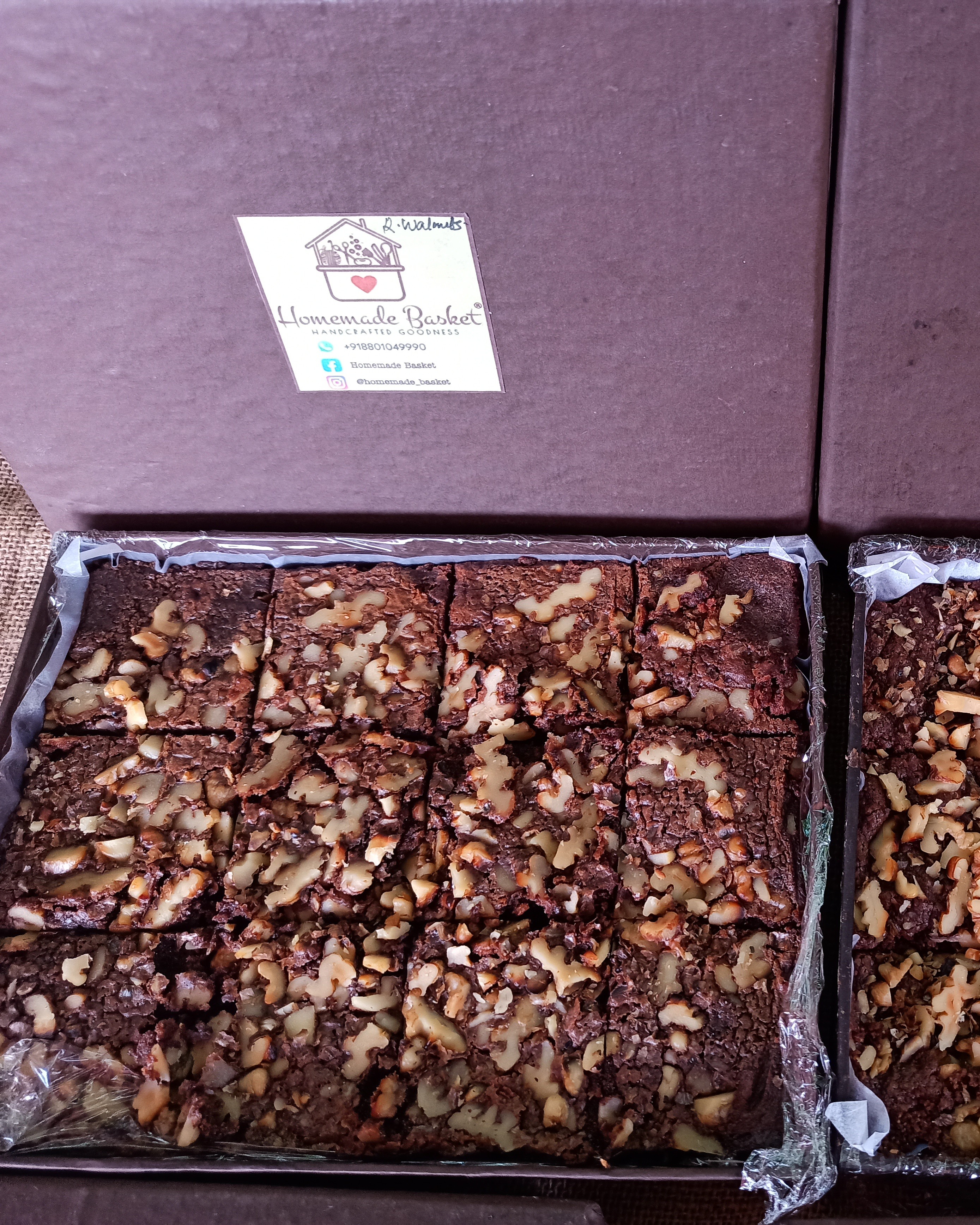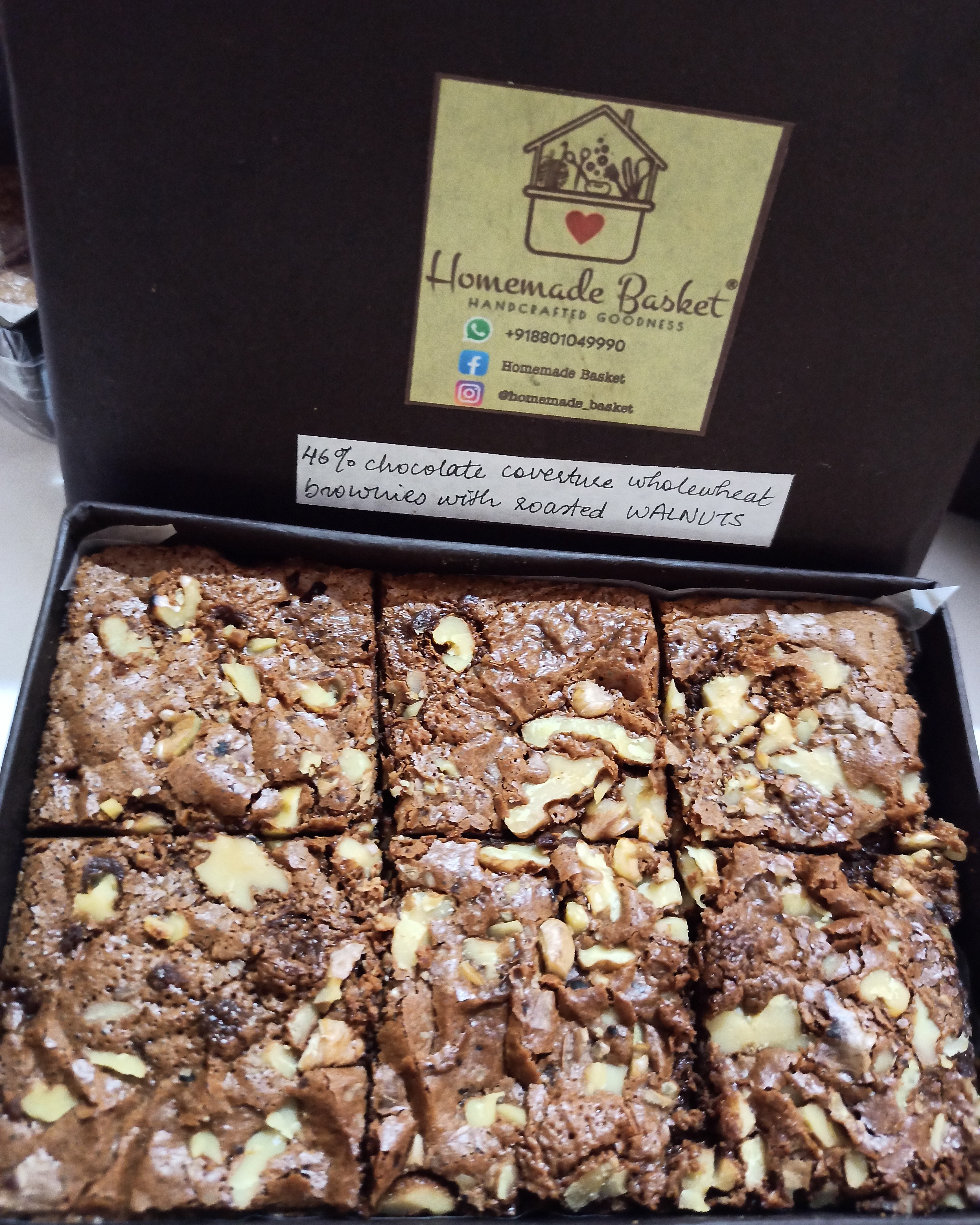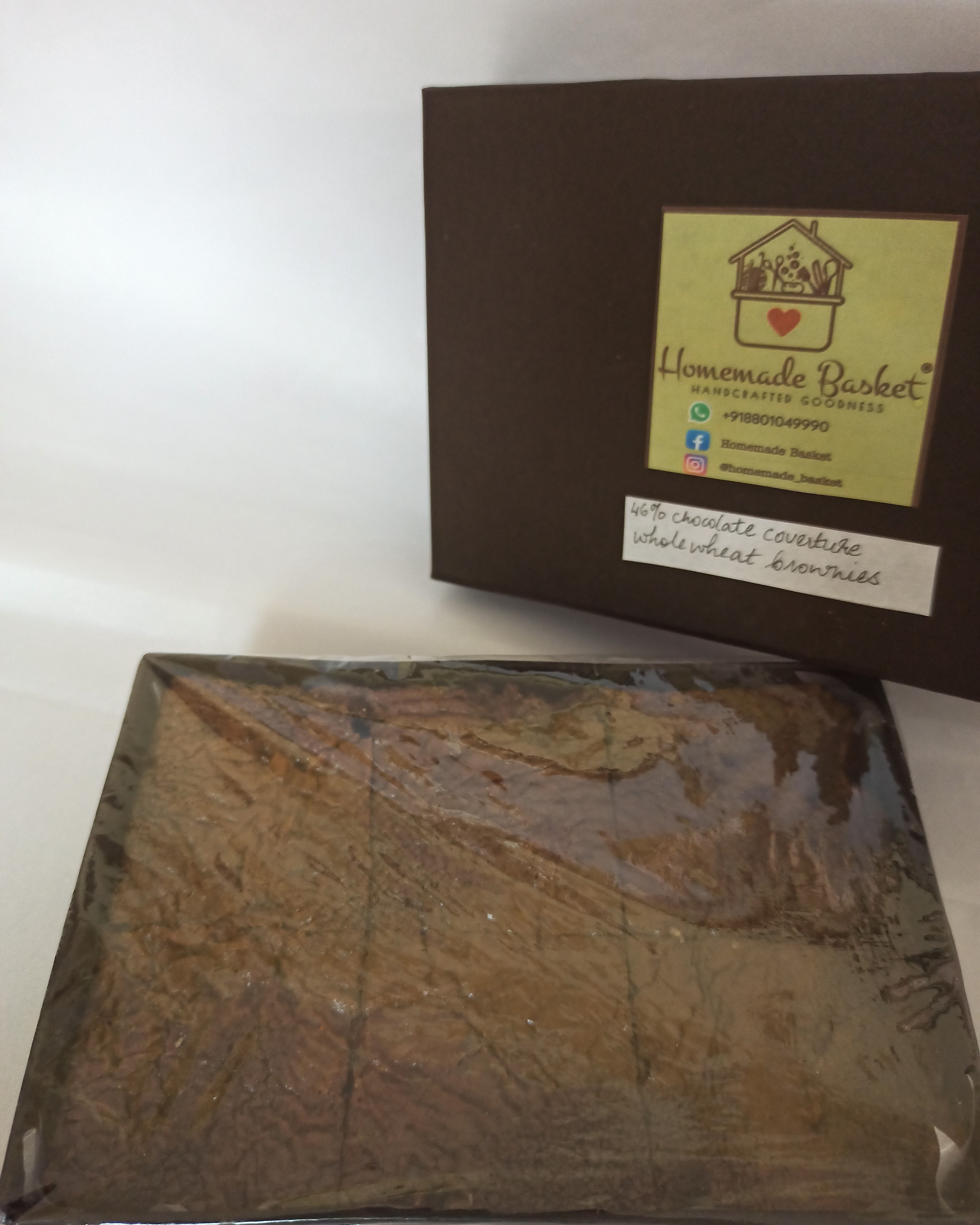 46% wholewheat brownies with cane jaggery as sweetner, with roasted Walnuts. Contains eggs.