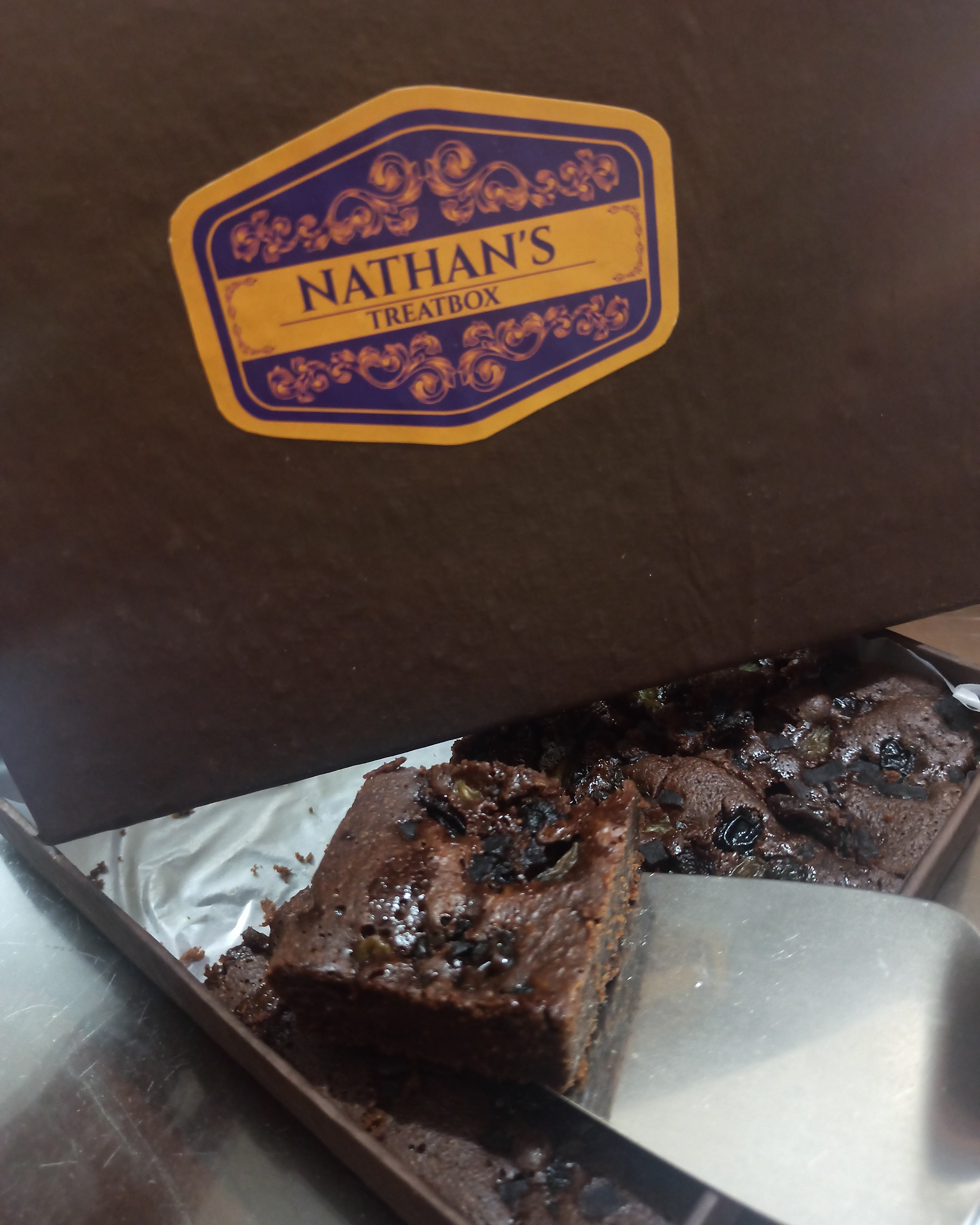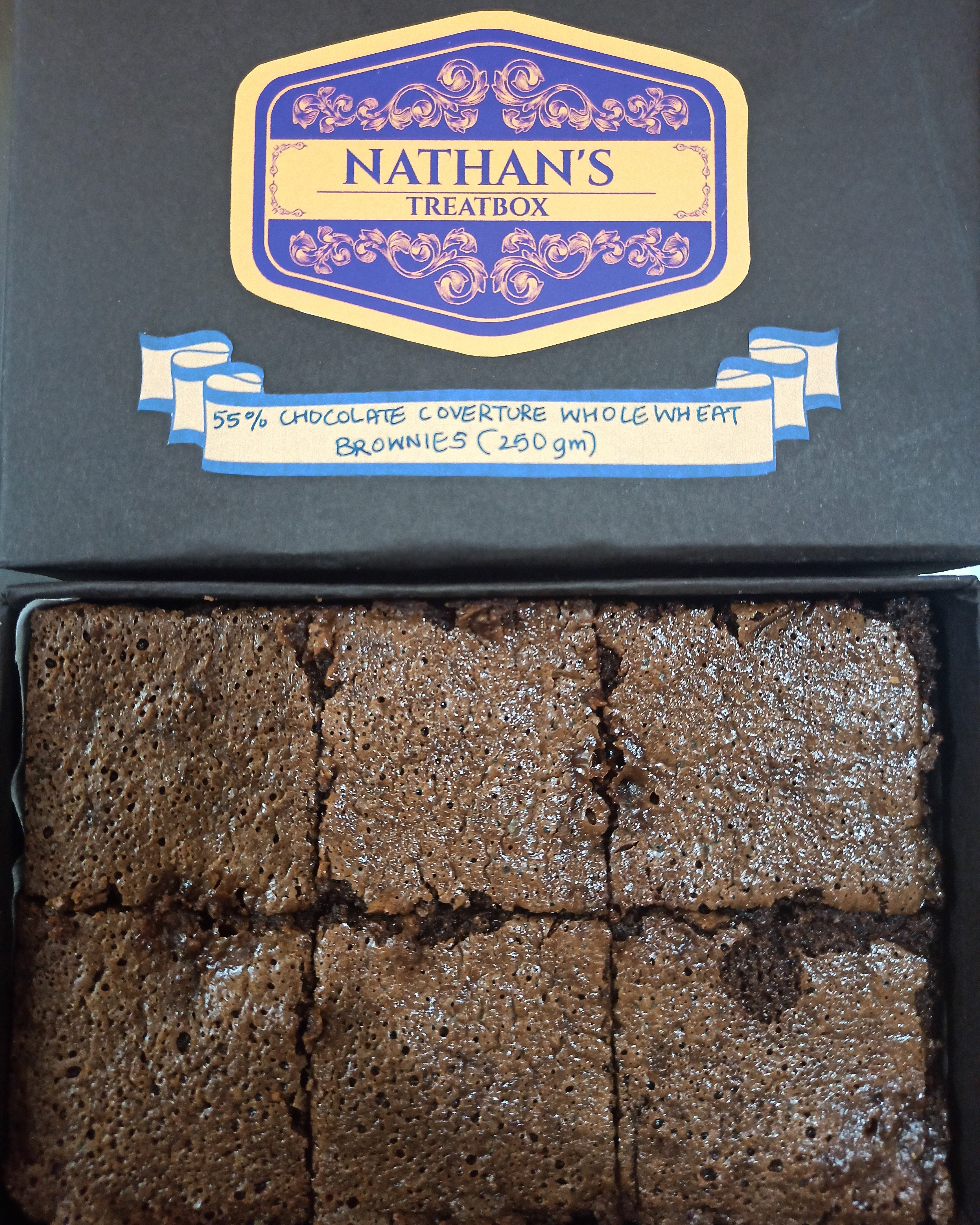 250 gms 55% chocolate coverture wholewheat brownies with roasted pecans. Contains EGGS