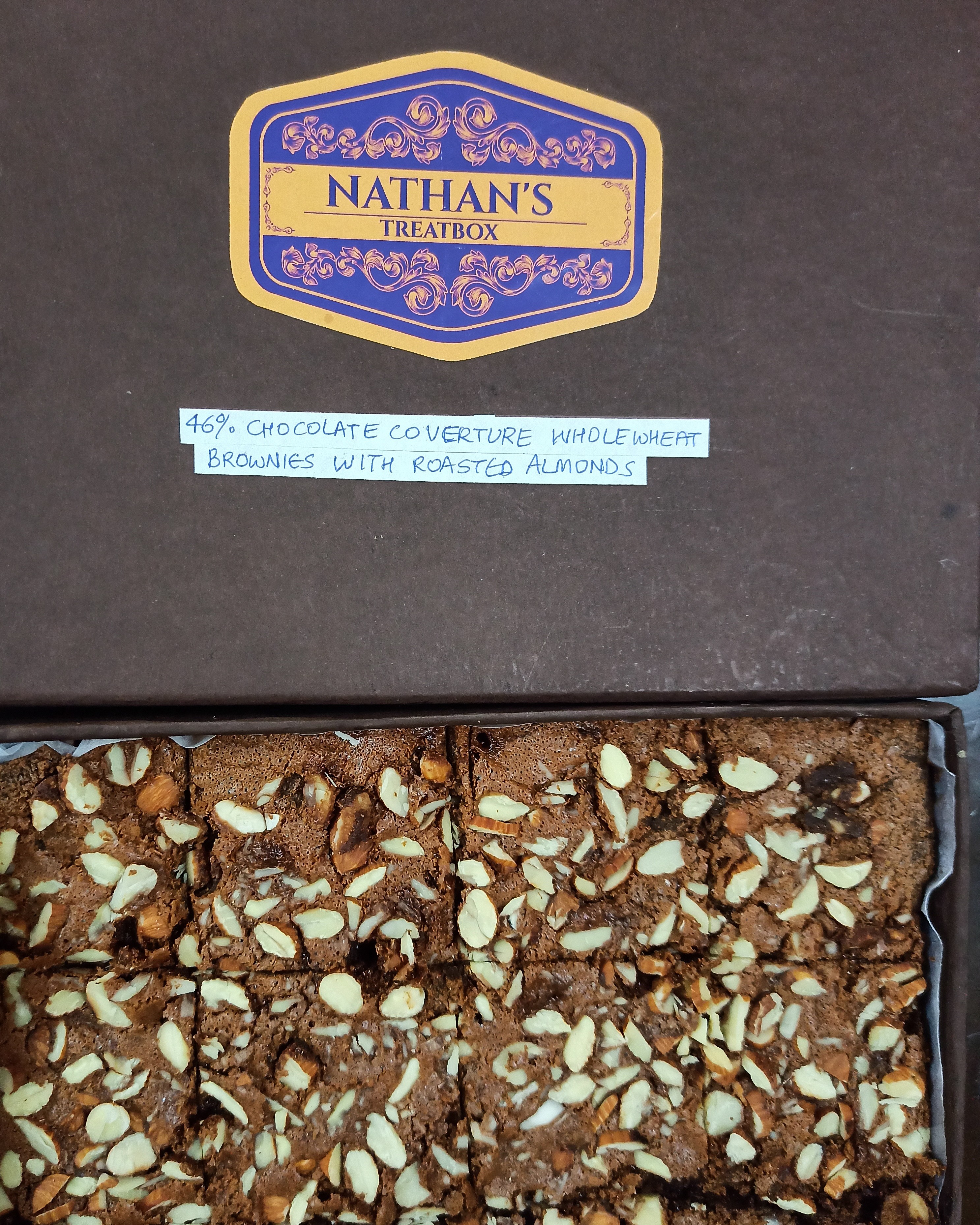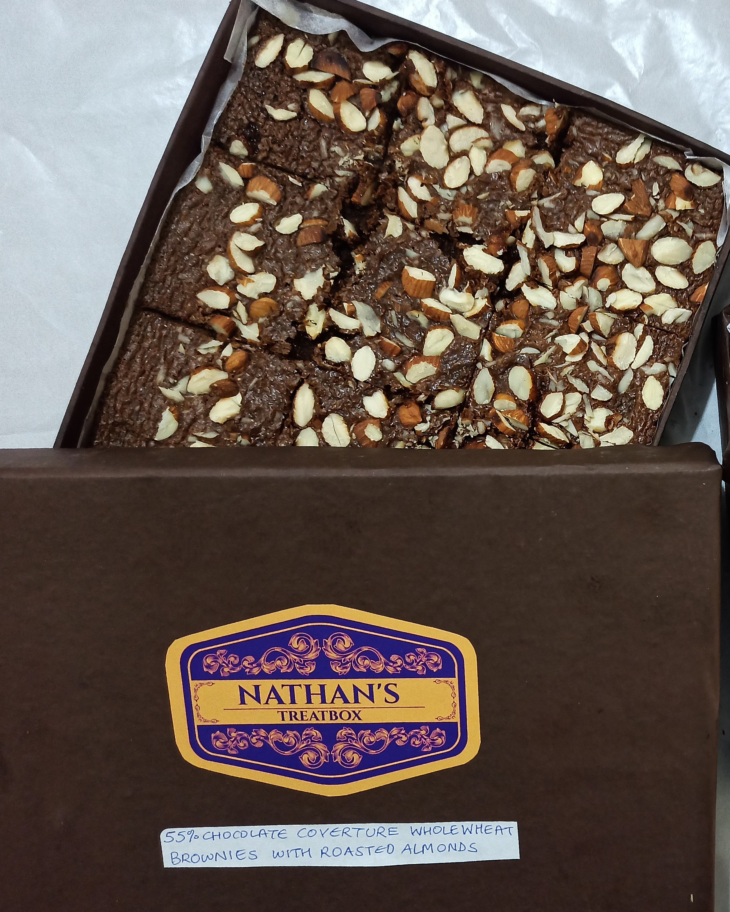 250 gms 55% chocolate coverture wholewheat brownies with roasted almonds. Contains EGGS