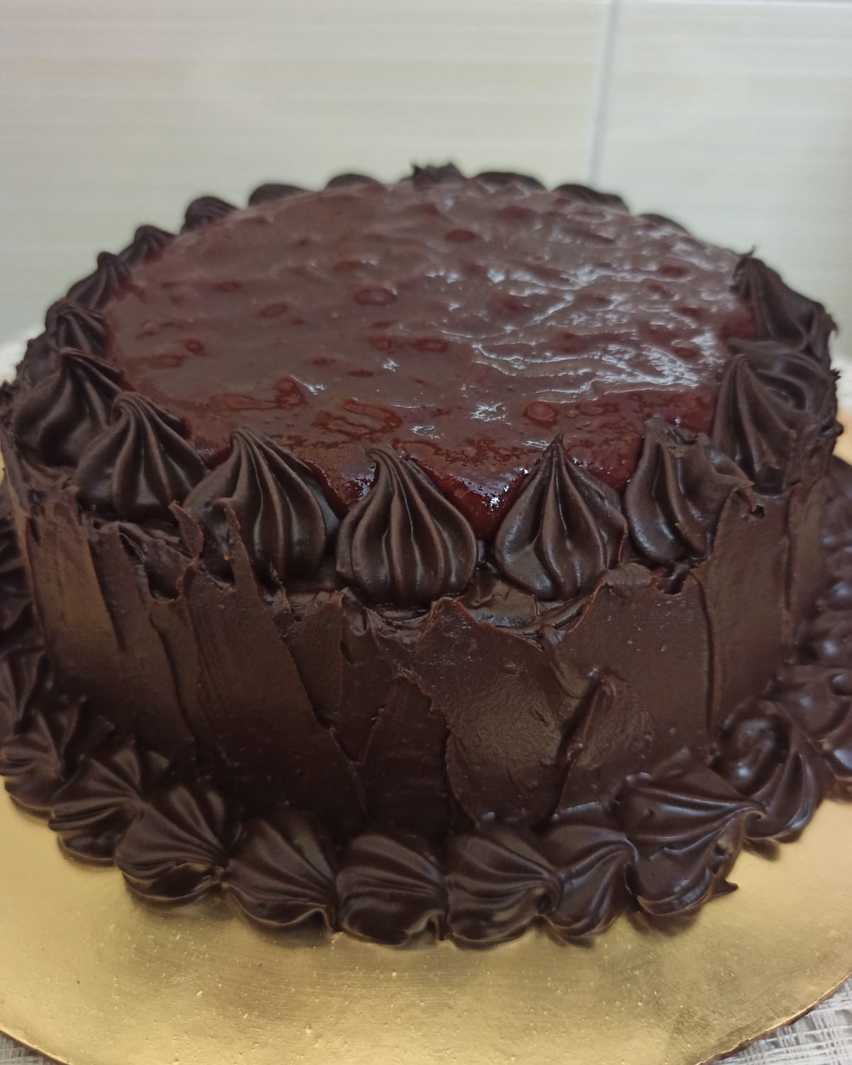 Chocolate cake with dark chocolate ganache, strawberry compote, dates, cake is one kg