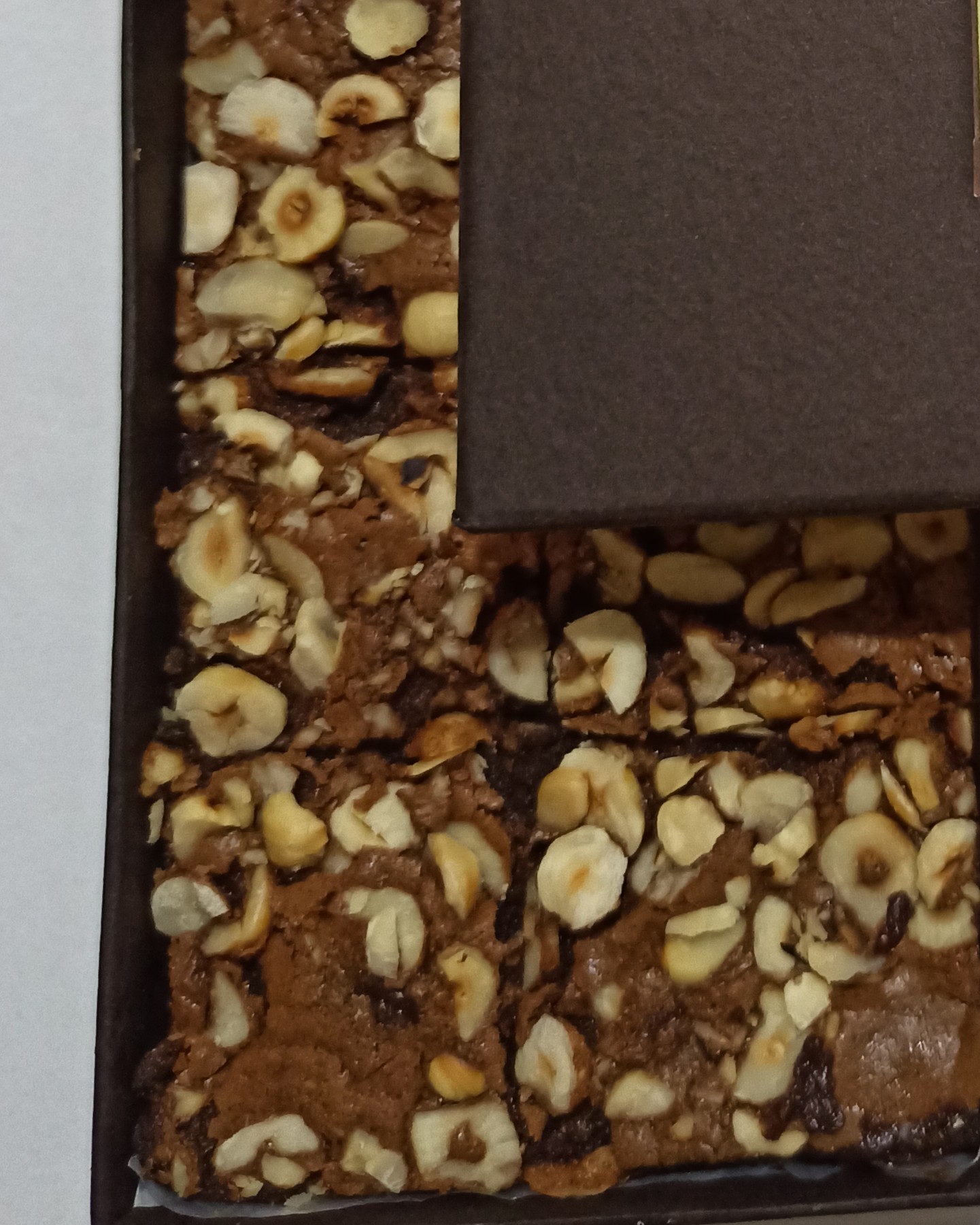 250 gms 55% chocolate coverture wholewheat brownies with roasted hazelnuts. Contains EGGS