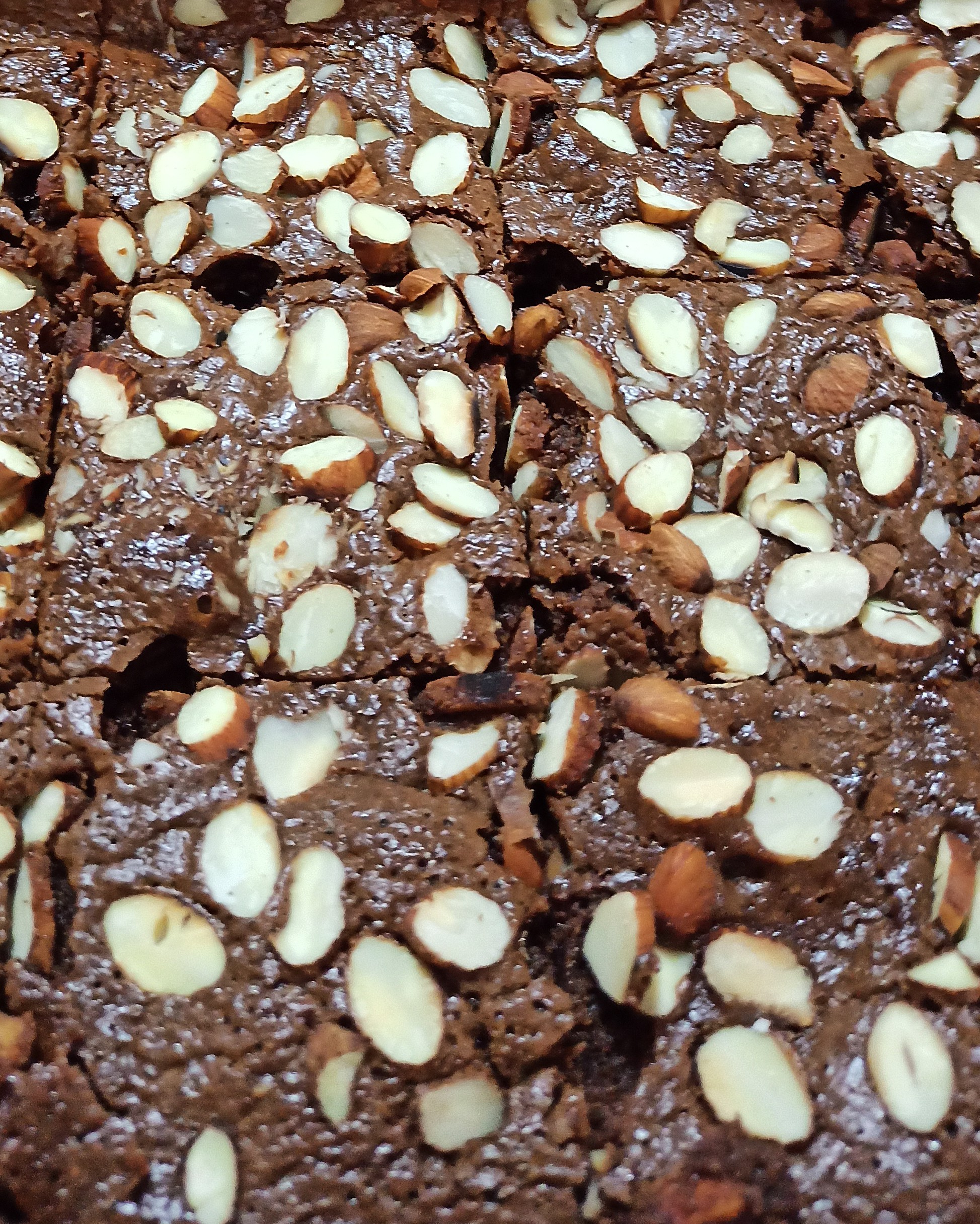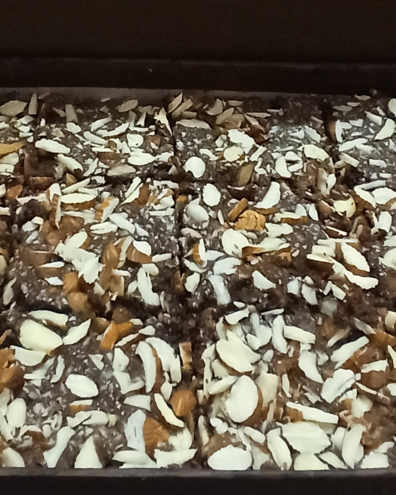 55% wholewheat brownies with jaggery as sweetner with roasted almonds, contains EGGS.