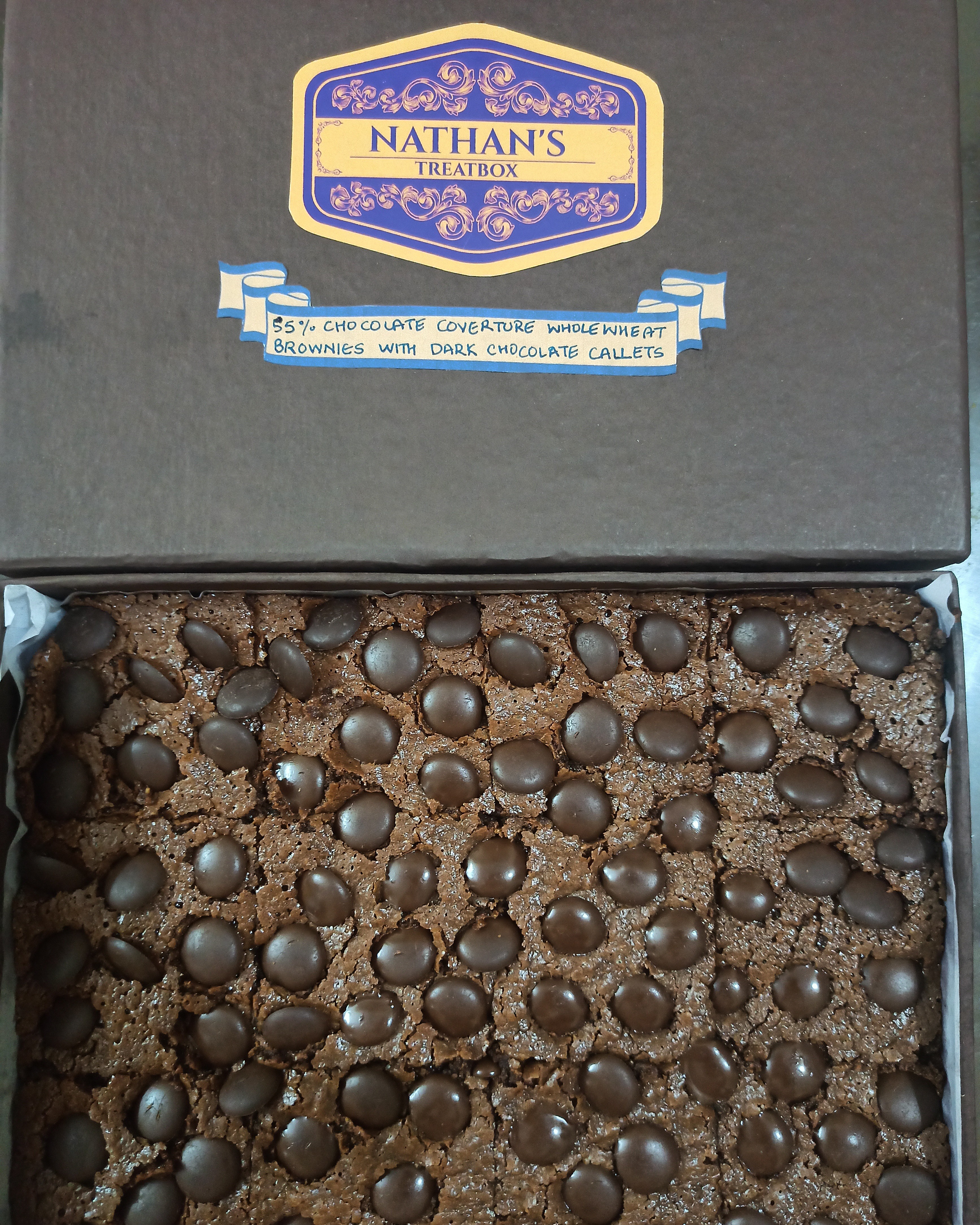 250 gms 55% chocolate coverture wholewheat brownies without any additional toppings. Contains EGGS
