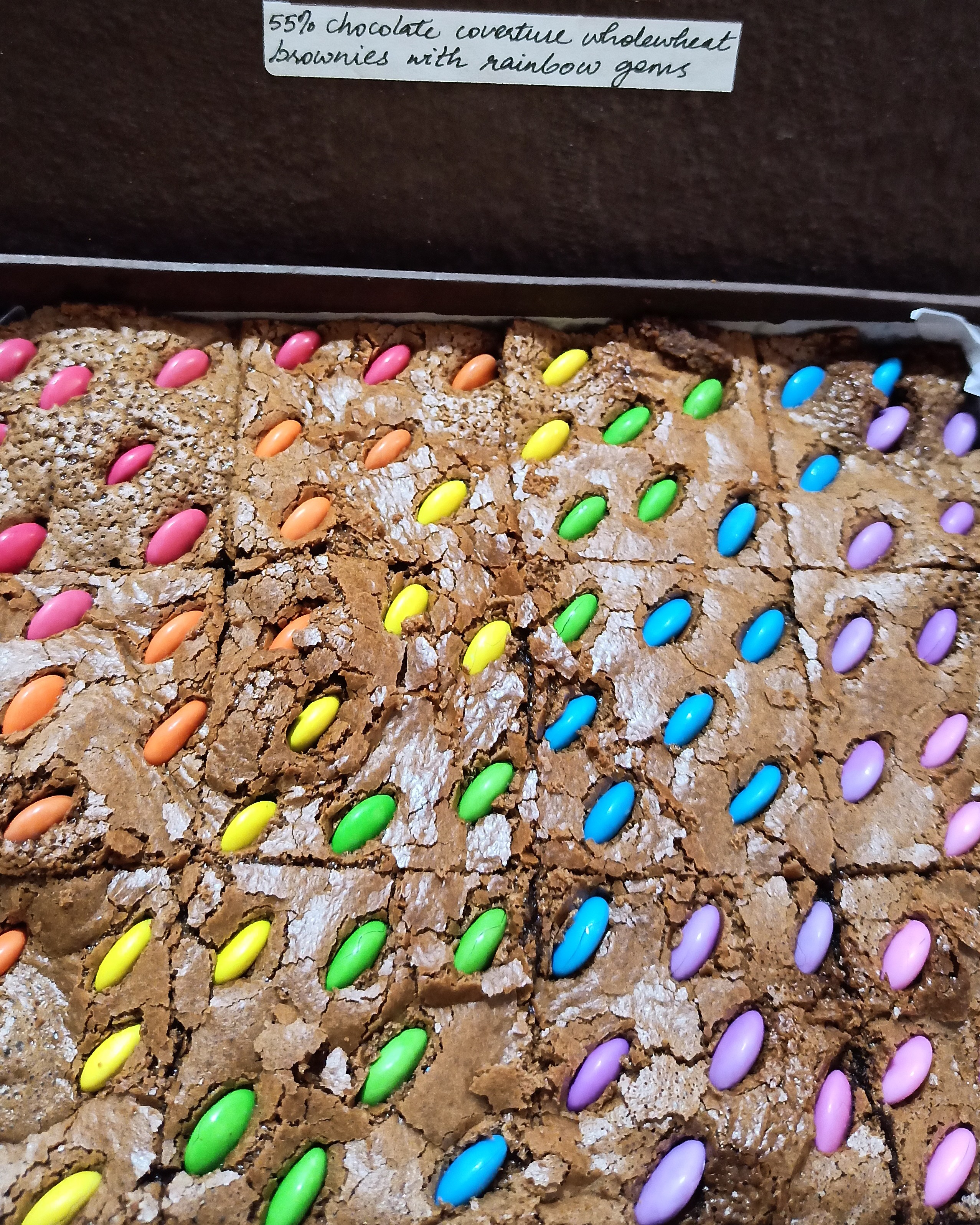 55% Couverture Chocolate Wholewheat Brownies with Gems. Contains EGG